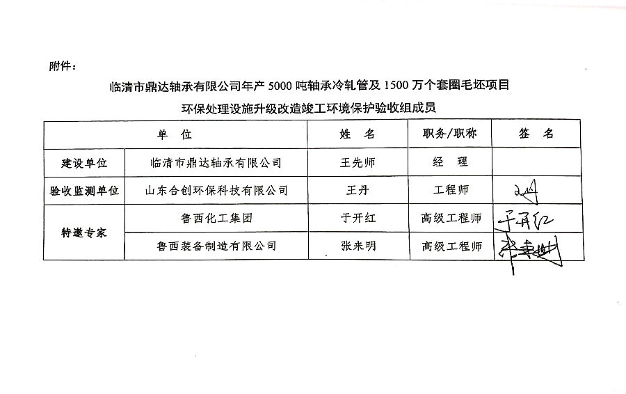 临清市鼎达轴承有限公司 年产 5000 吨轴承冷轧管及 1500 万个套圈毛坯项目 环保处理设施升级改造竣工环境保护验收组签字