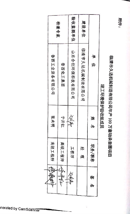 临清市久达机械制造有限公司 年产100万套轴承套圈项目 竣工环境保护验收组签字