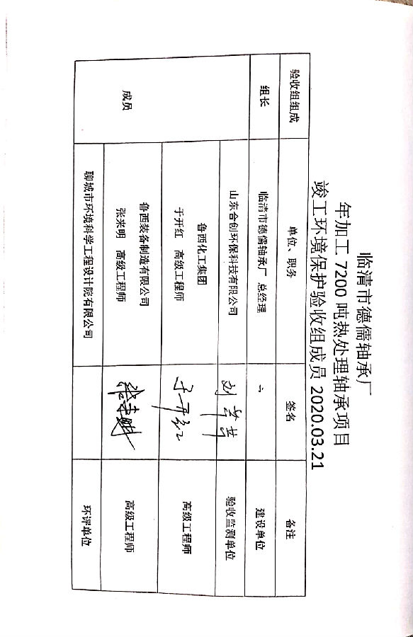 临清市徳儒轴承厂 年加工 7200 吨热处理轴承项目 竣工环境保护验收组签字