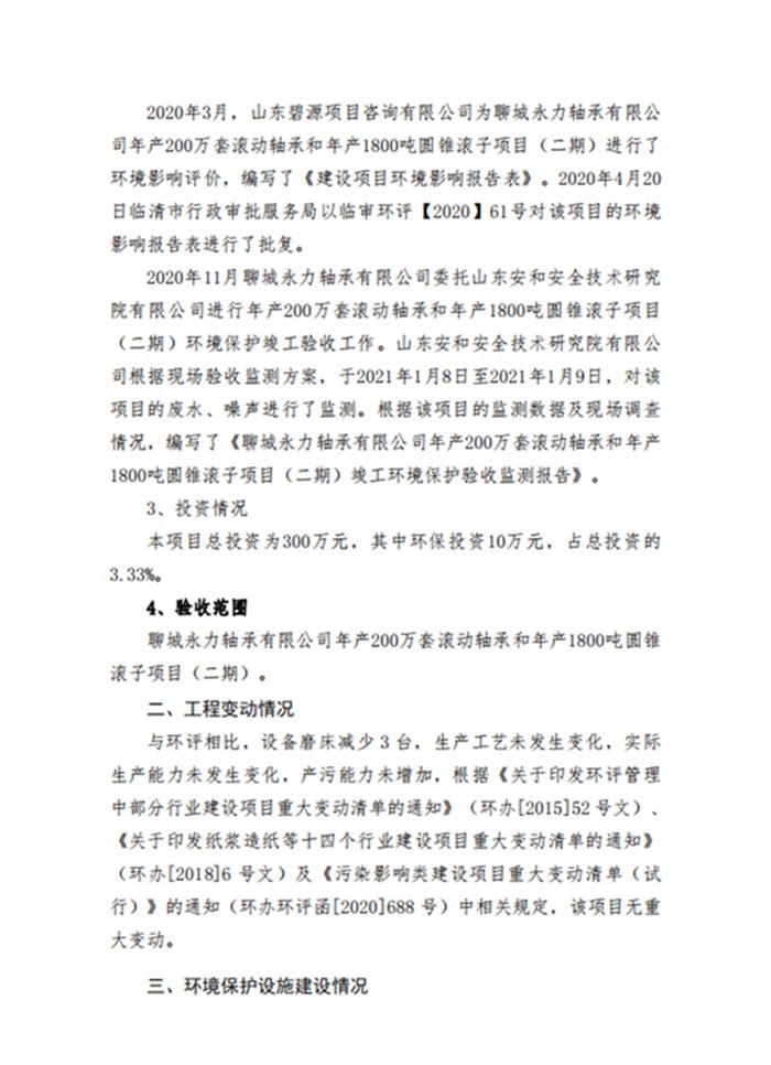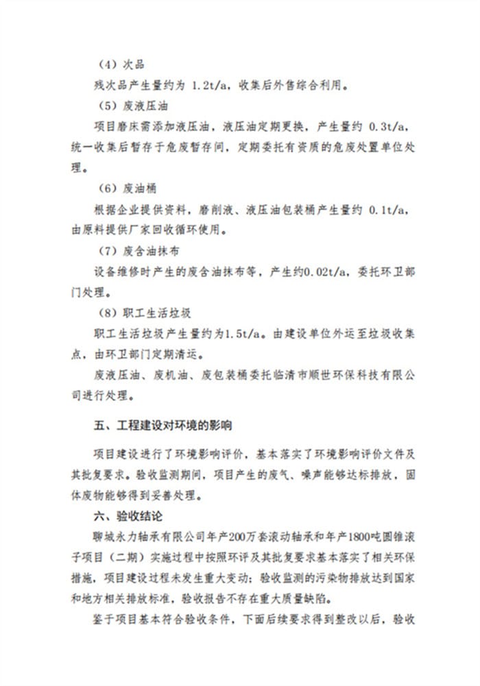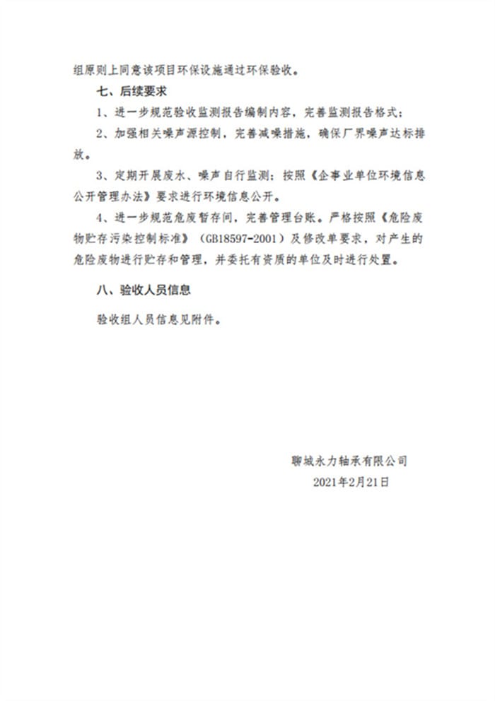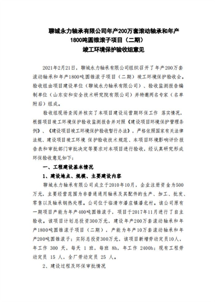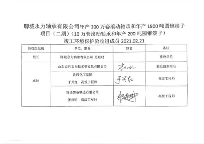 聊城永力轴承有限公司(二期)验收专家意见、签字公示