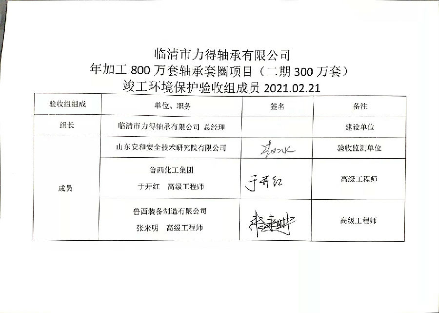 临清市力得轴承有限公司年加工800万套轴承套圈项目(二期300万套)验收转件签字、意见