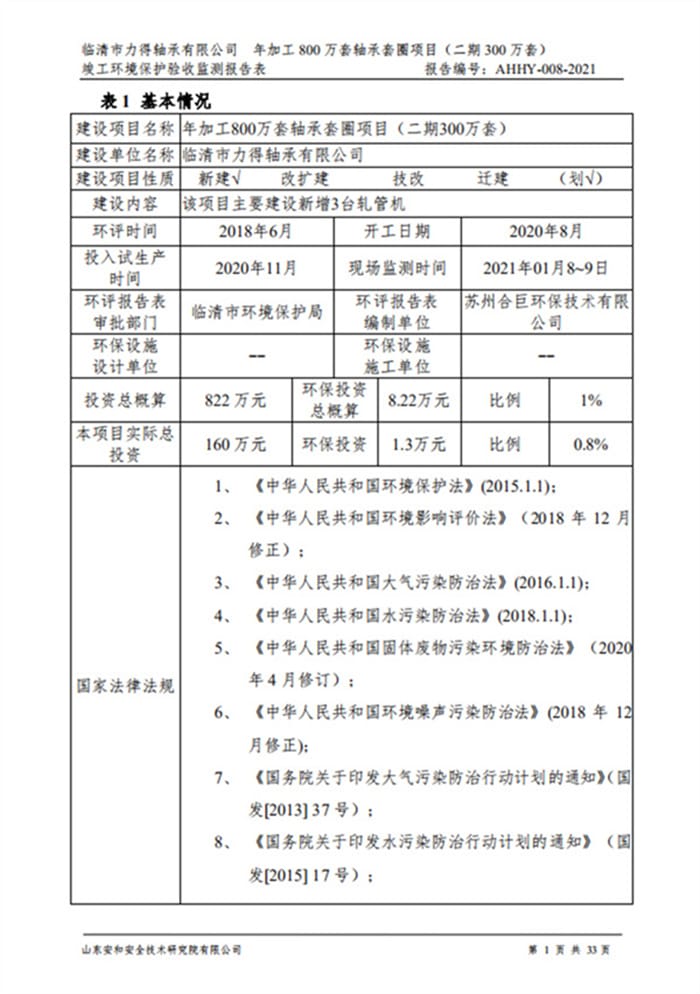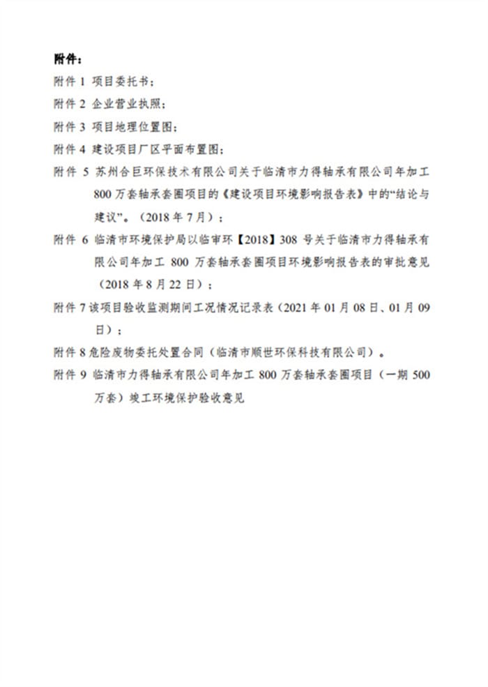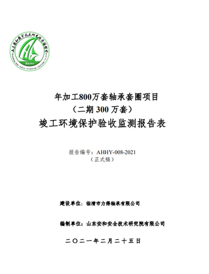 临清市力得轴承有限公司年加工800万套轴承套圈项目(二期300万套)验收报告