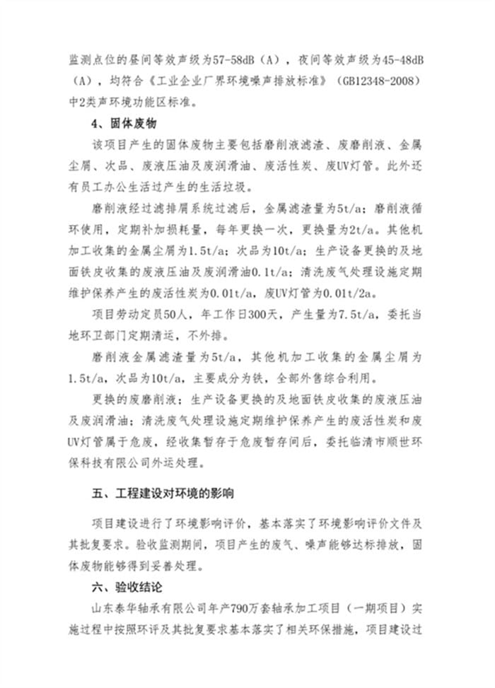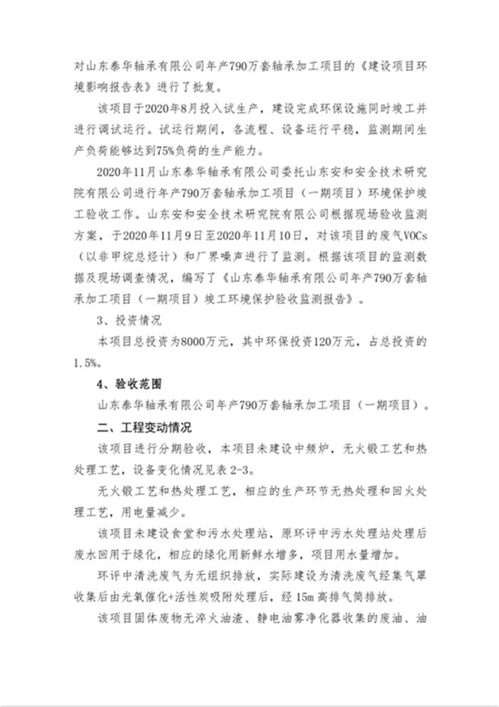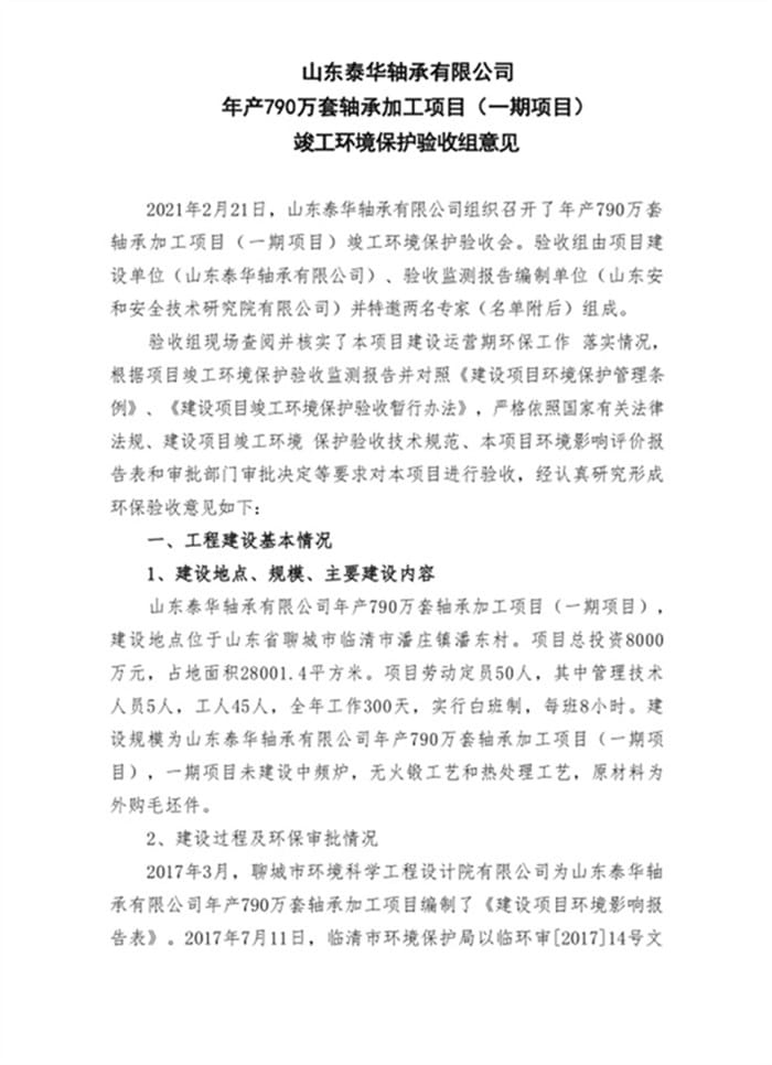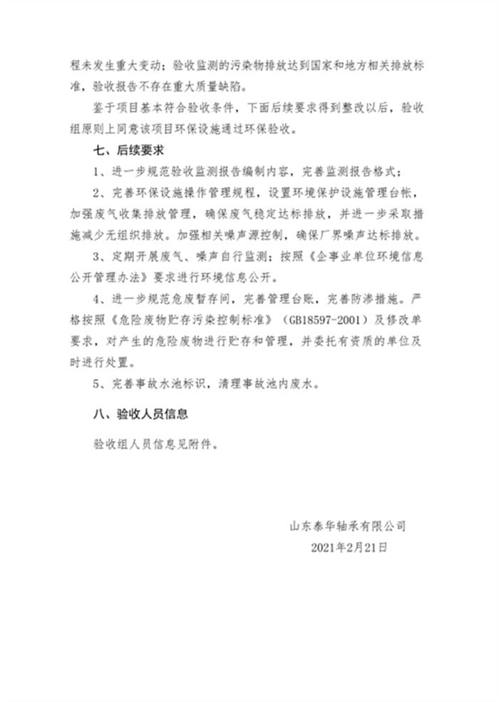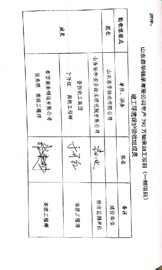 山东泰华轴承有限公司年产790万套轴承项目(一期项目)验收意见、签字