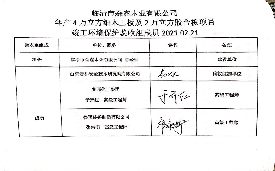 临清市森鑫木业有限公司年产4万立方细木工板及2万立方胶合板项目验收报告(专家签字)