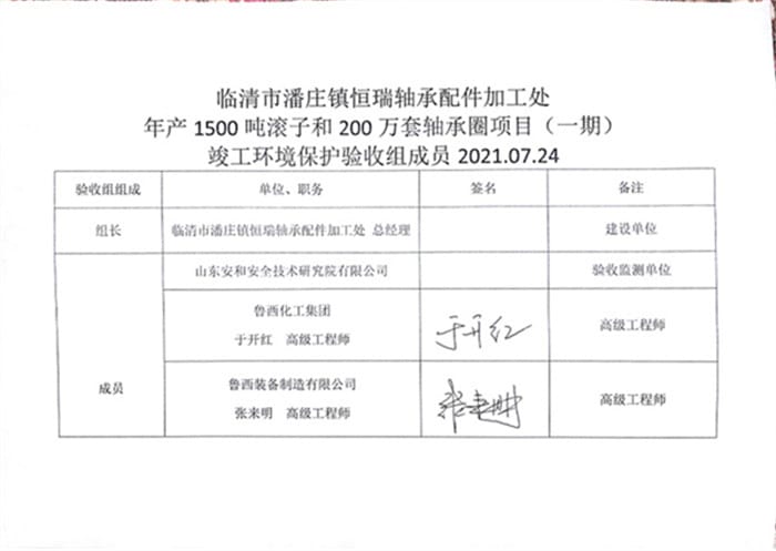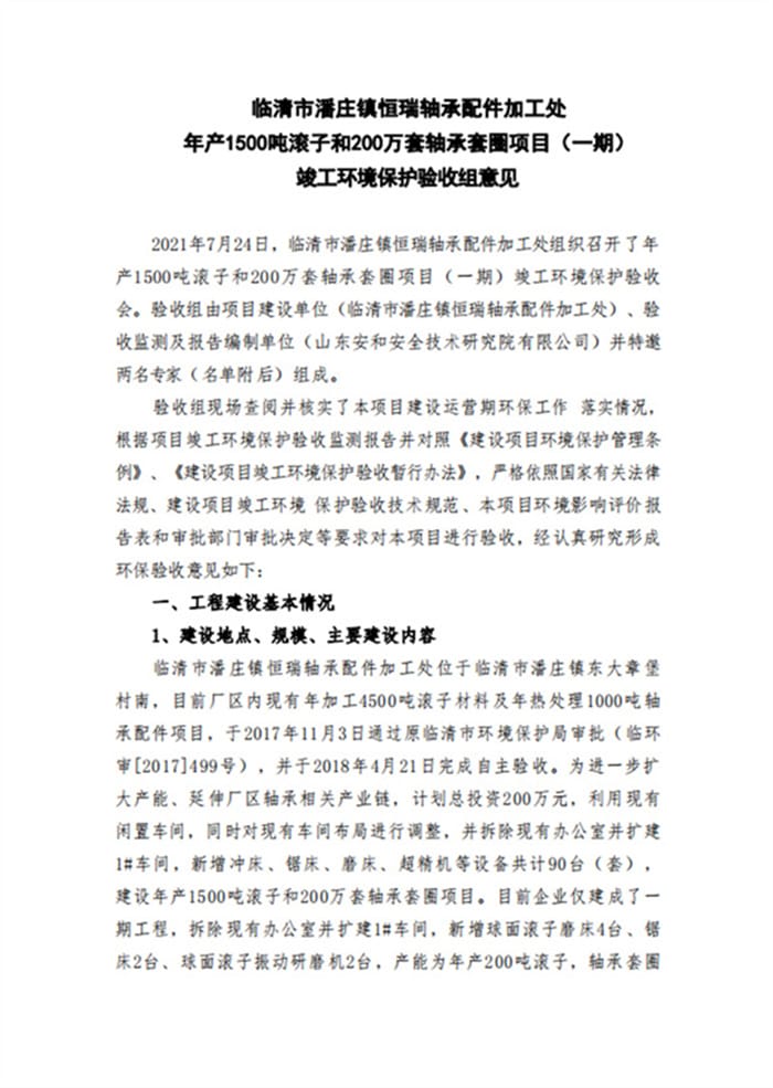 临清市潘庄镇恒瑞轴承配件加工处年产1500吨滚子和200万套轴承圈项目(一期)专家意见和签字