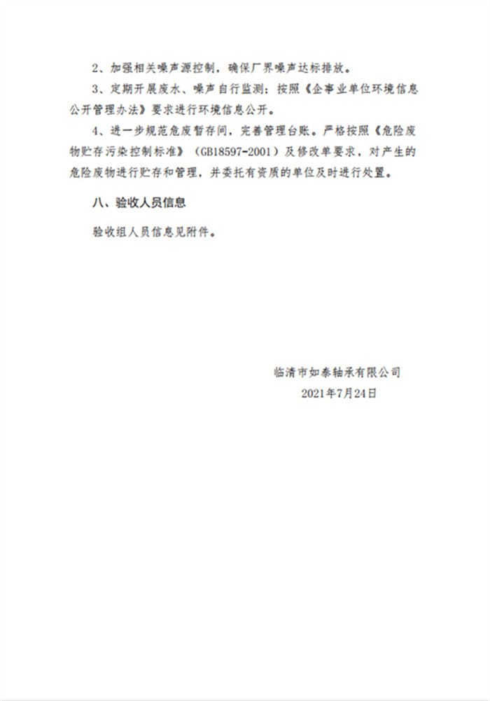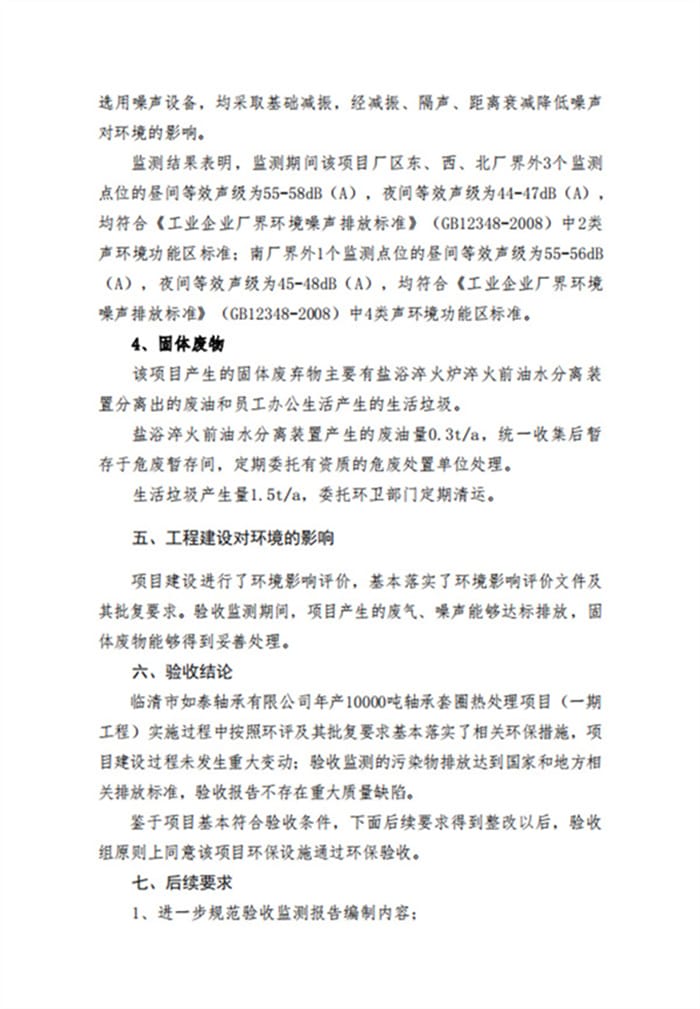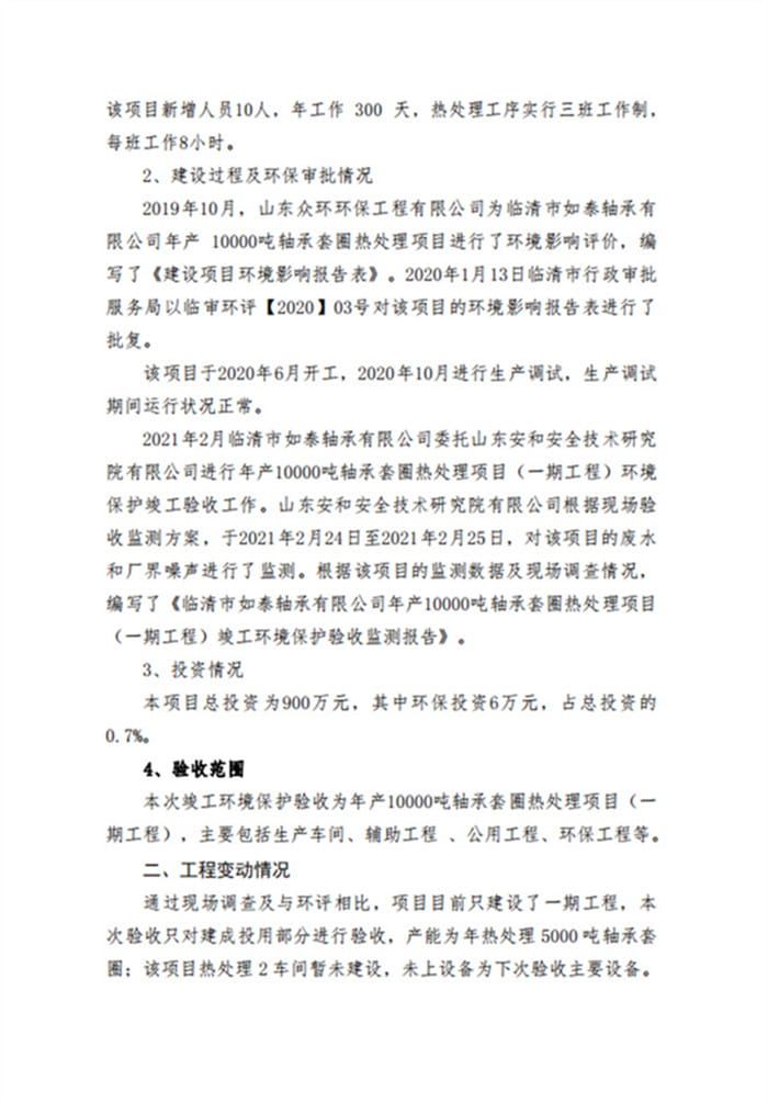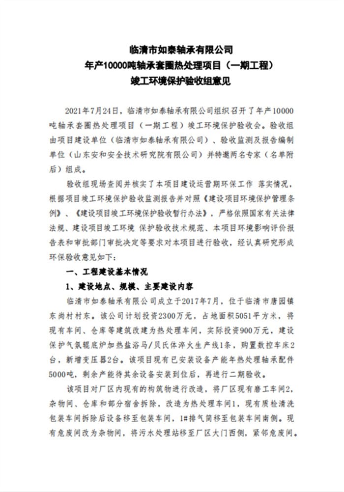 临清市如泰轴承有限公司年产10000吨轴承套圈热处理项目(一期工程)验收签字和专家意见