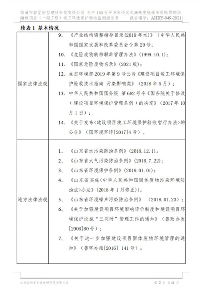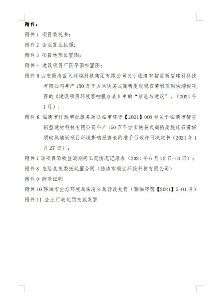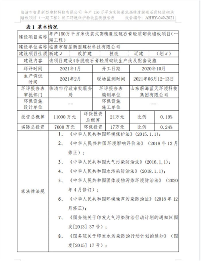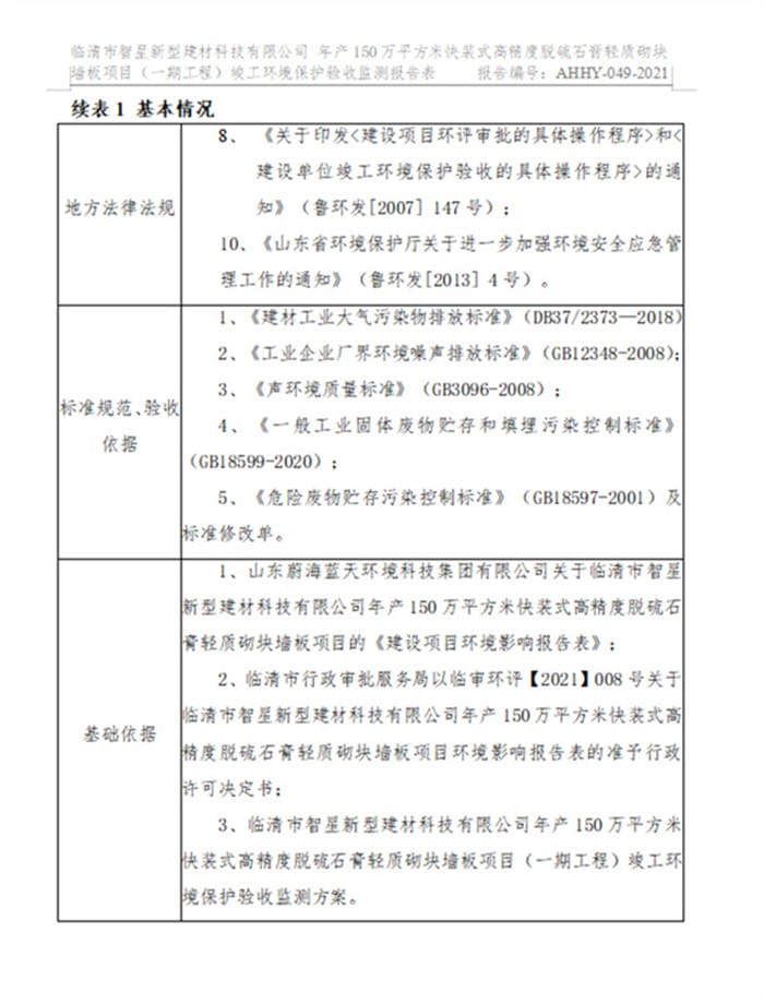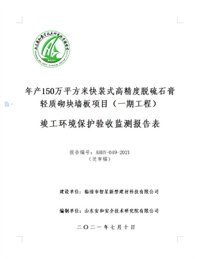 临清市智星新型建材科技有限公司年产150万平方米快装式高精度脱硫石膏轻质砌块墙板项目验收报告