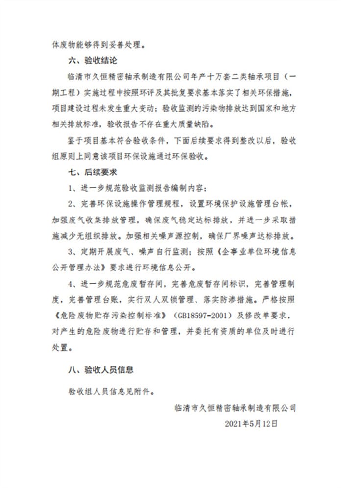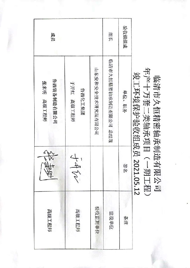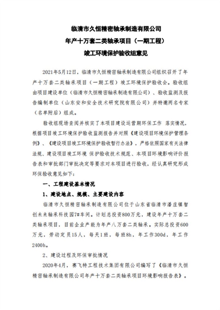 临清市久恒精密轴承制造有限公司年产十万套二类轴承项目(一期工程)验收意见及专家签字