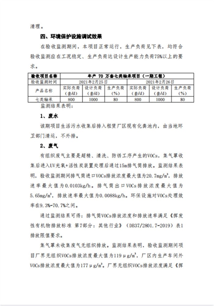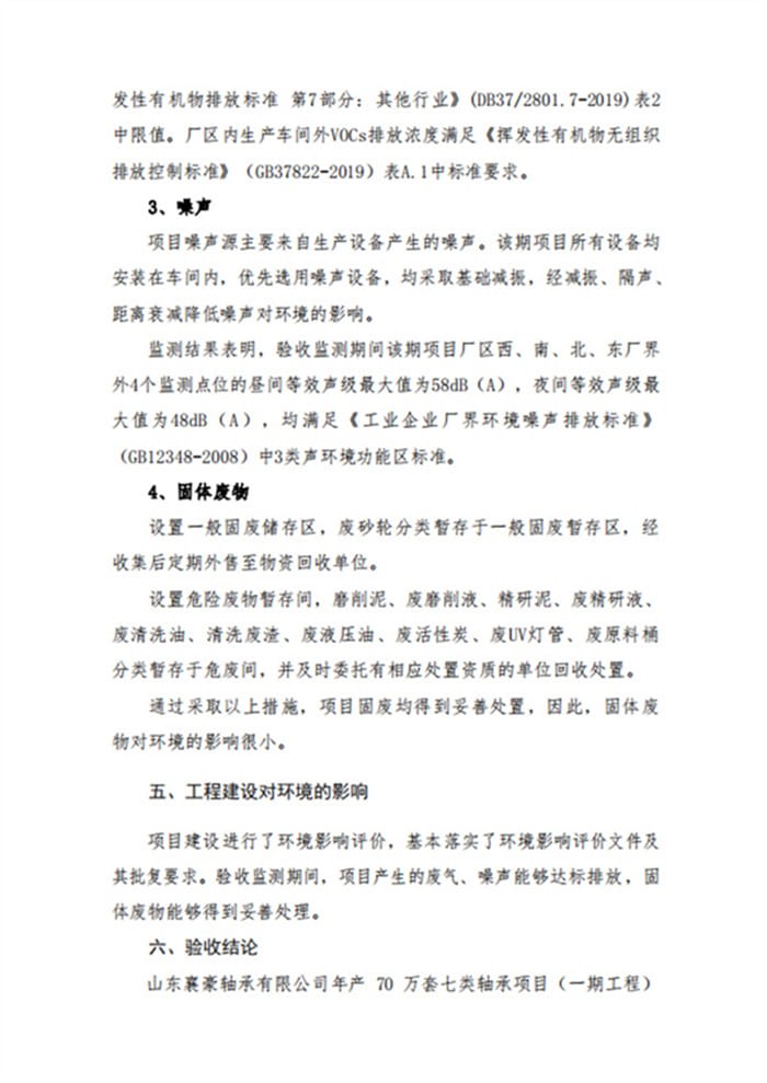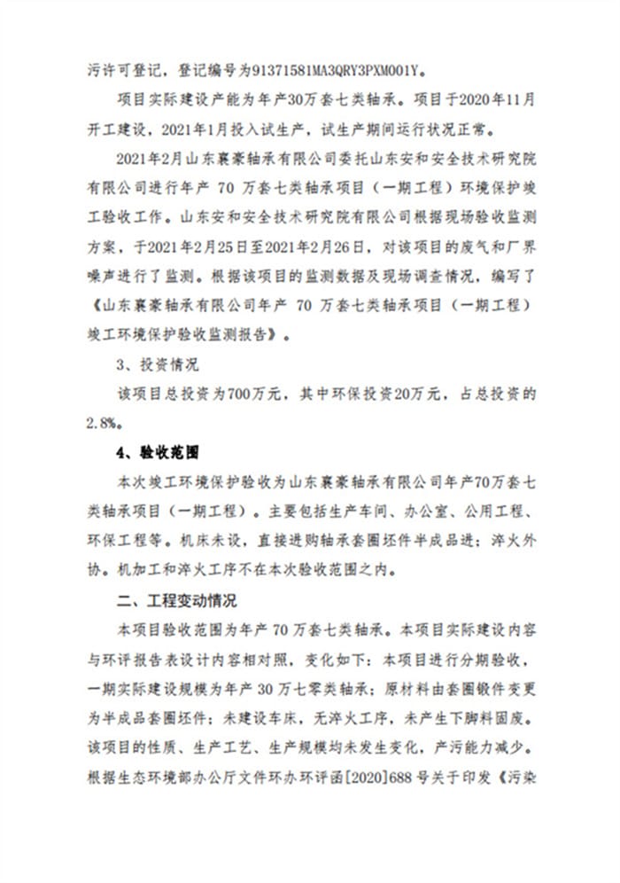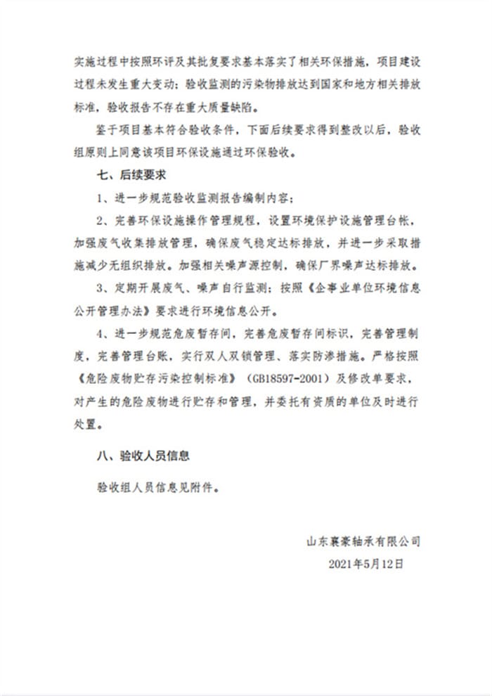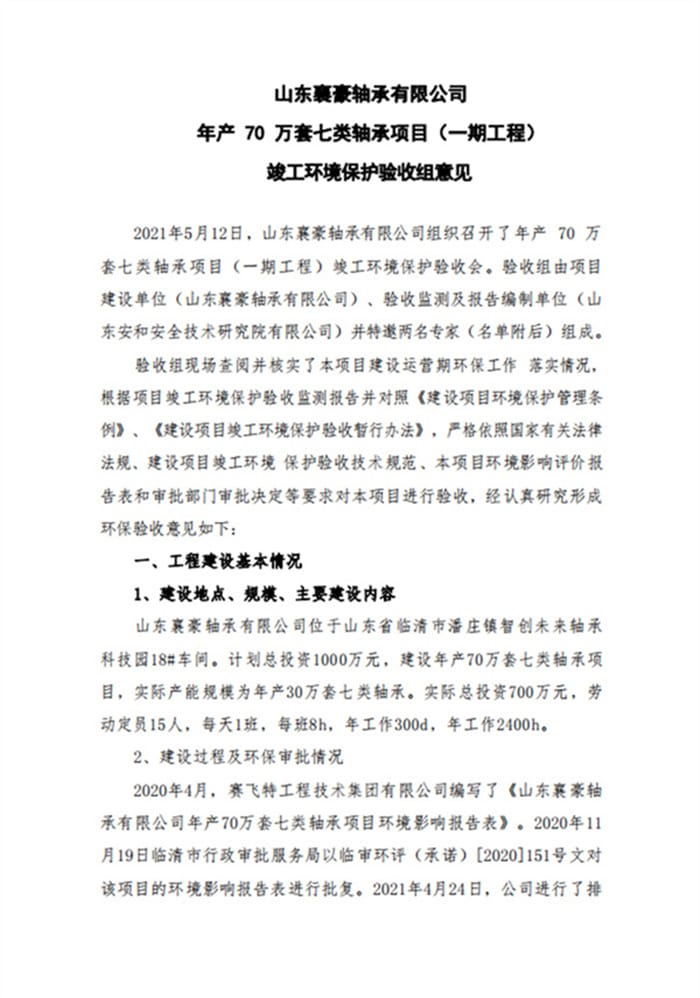 山东襄豪轴承有限公司年产70万套七类轴承项目(一期工程)验收意见