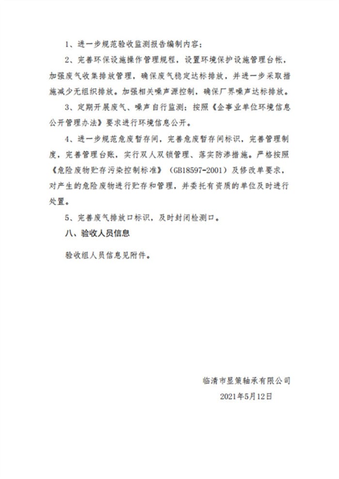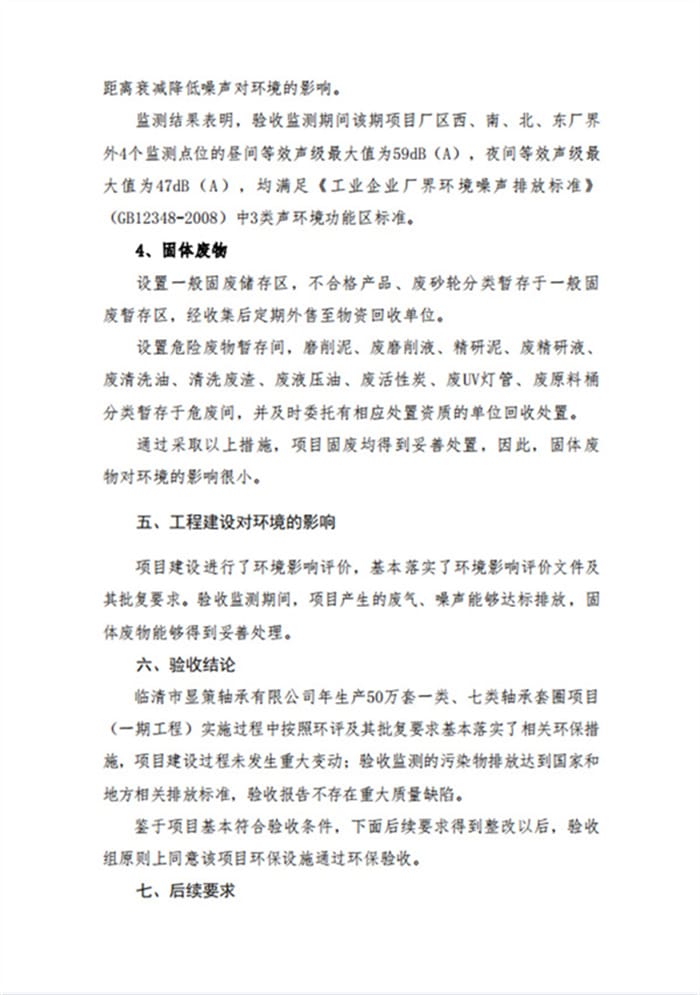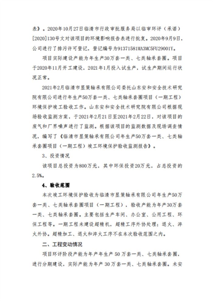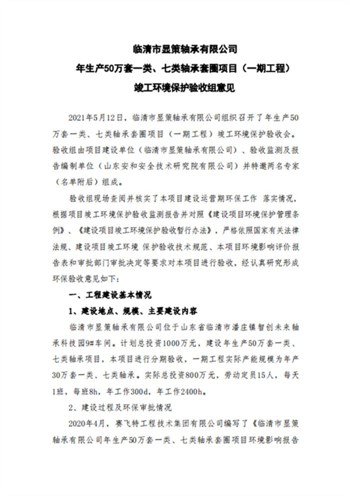 临清市显策轴承有限公司年生产50万套一类、七类轴承套圈项目(一期工程)验收意见