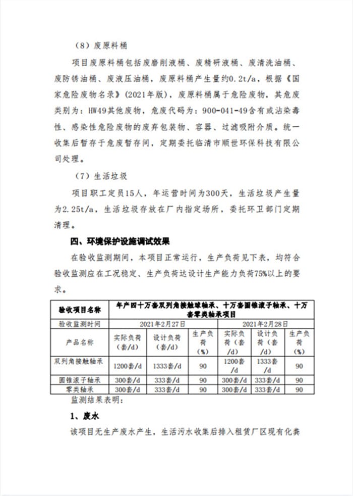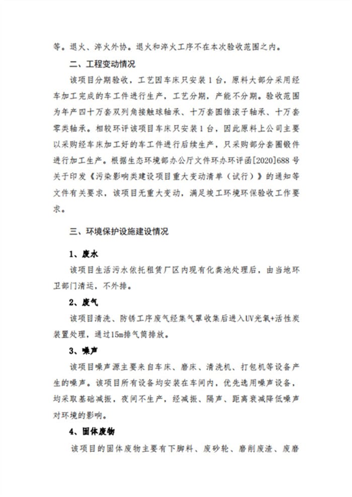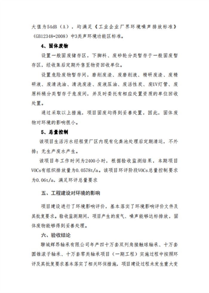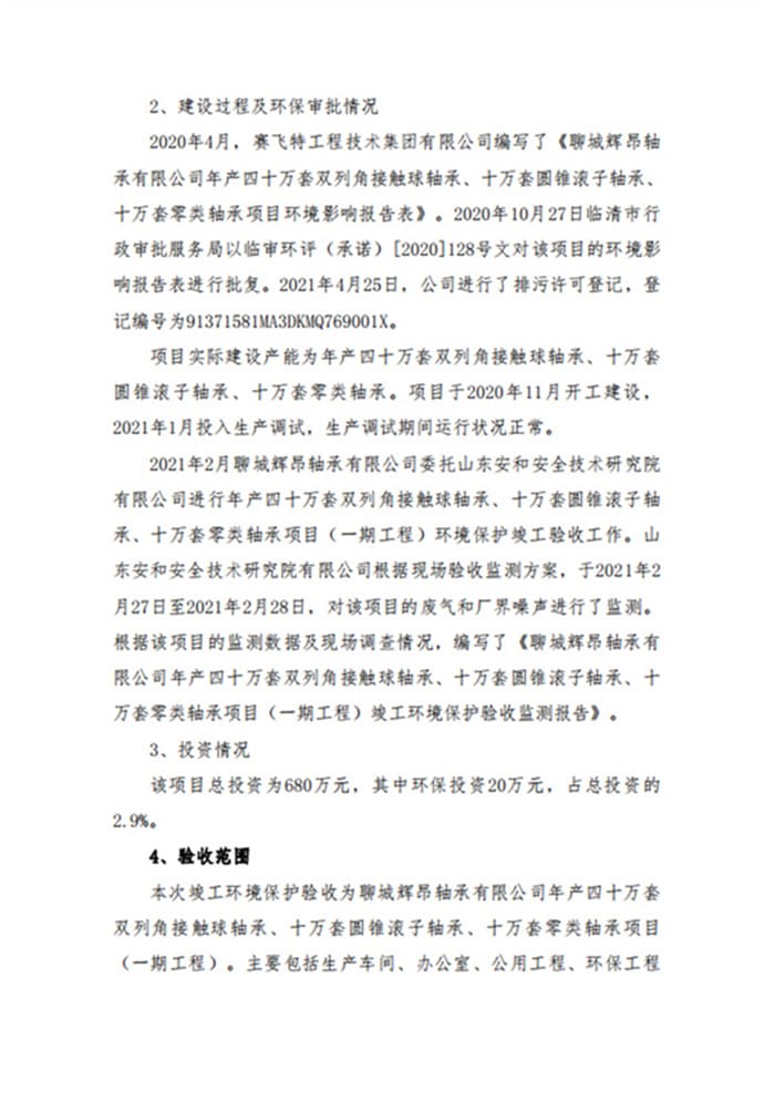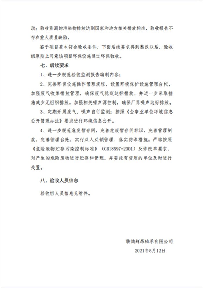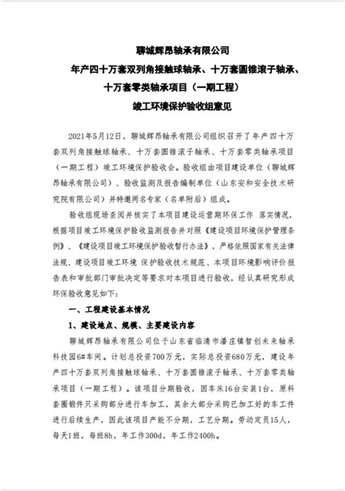 聊城辉昂轴承有限公司年产四十万套双列角接触球轴承、十万套圆锥滚子轴承、十万套零类轴承项目(一期工程)验收意见