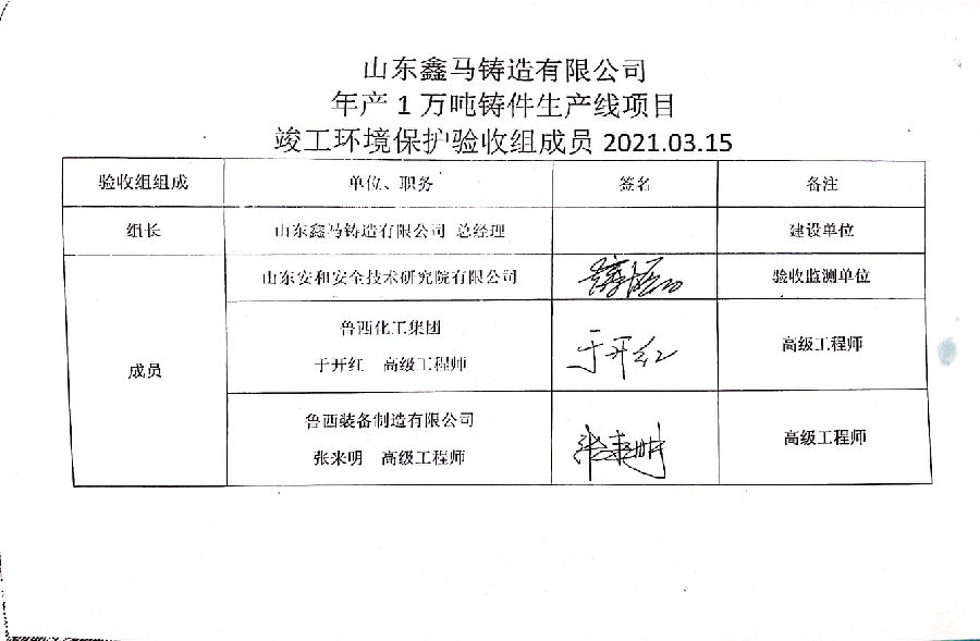 山东鑫马铸造有限公司年产1万吨铸件生产线项目专家签字