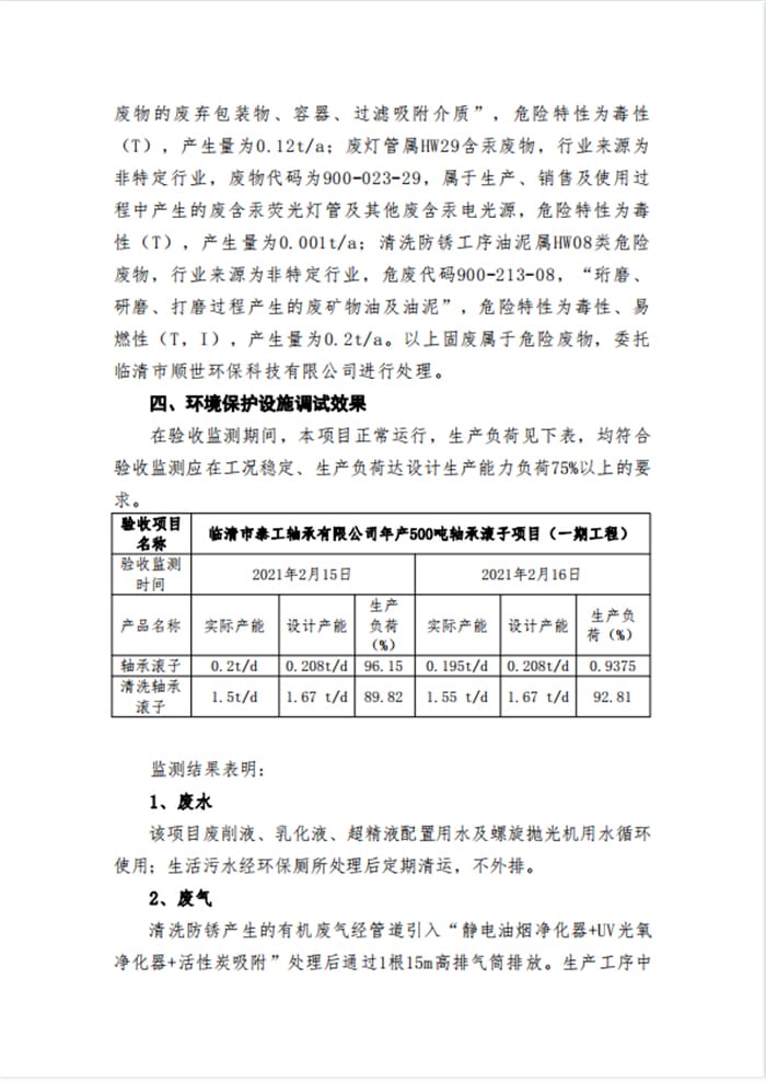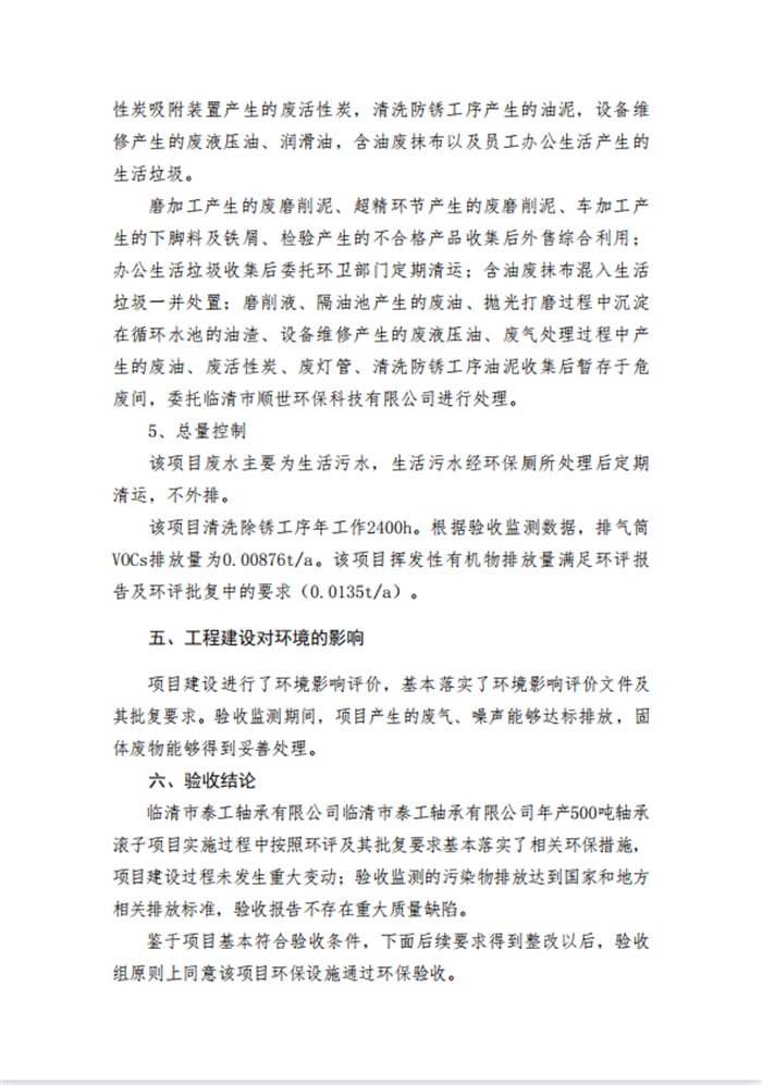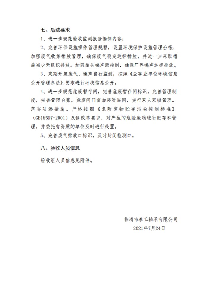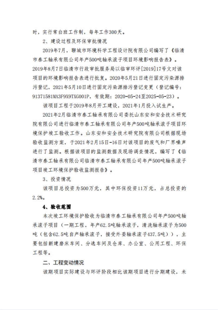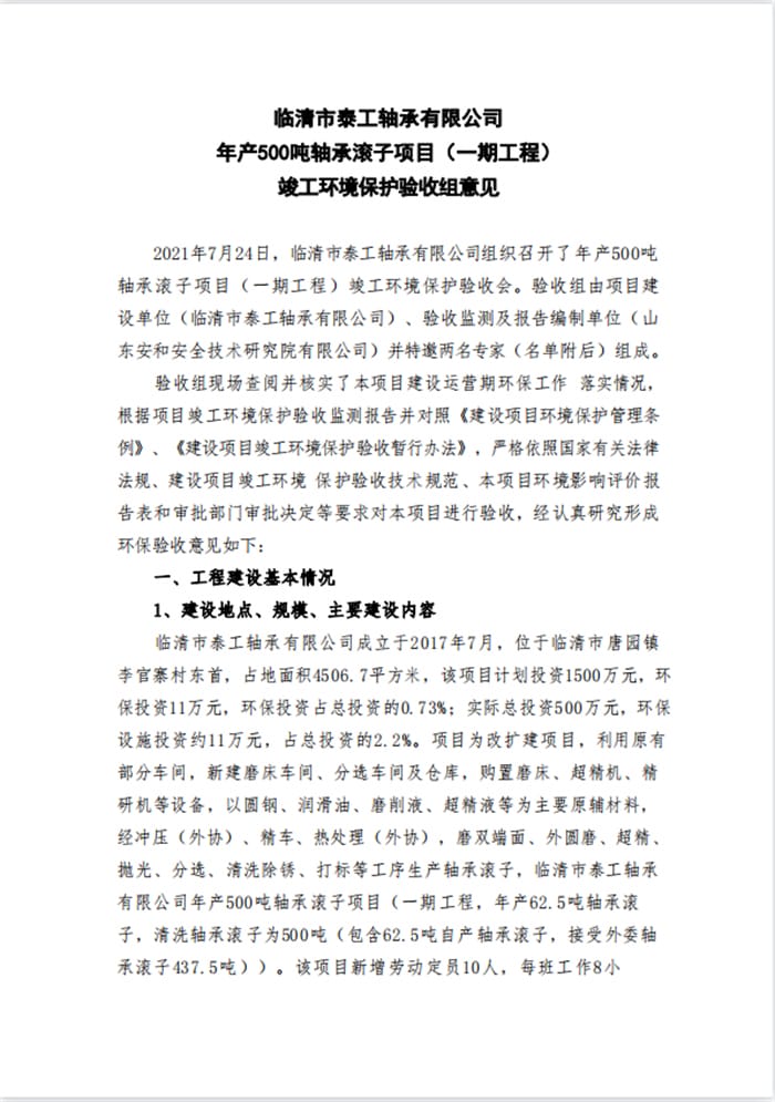 临清市泰工轴承有限公司年产500吨轴承滚子项目(一期工程)验收专家意见