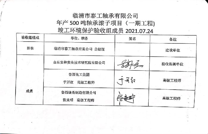 临清市泰工轴承有限公司年产500吨轴承滚子项目(一期工程)专家签字