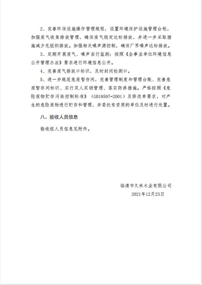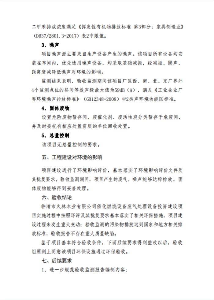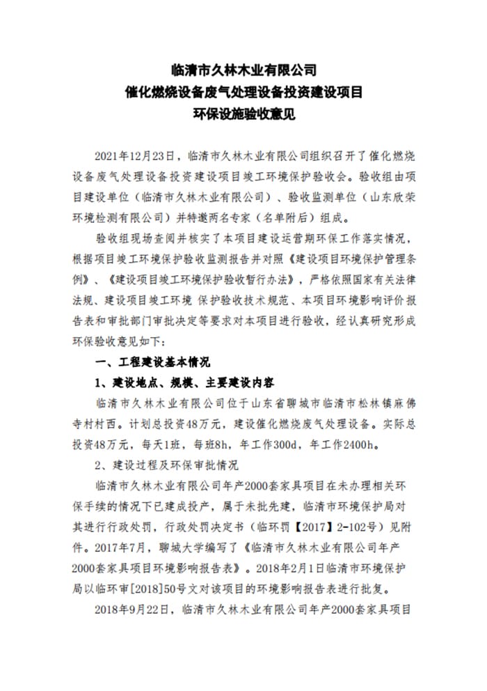 临清市久林木业有限公司催化燃烧设备废气处理设备投资建设项目验收专家意见