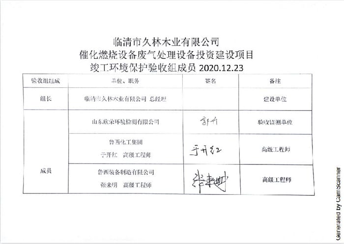 临清市久林木业有限公司催化燃烧设备废气处理设备投资建设项目验收专家签字