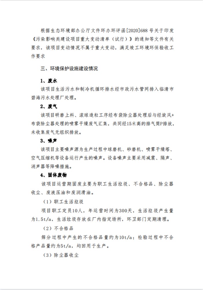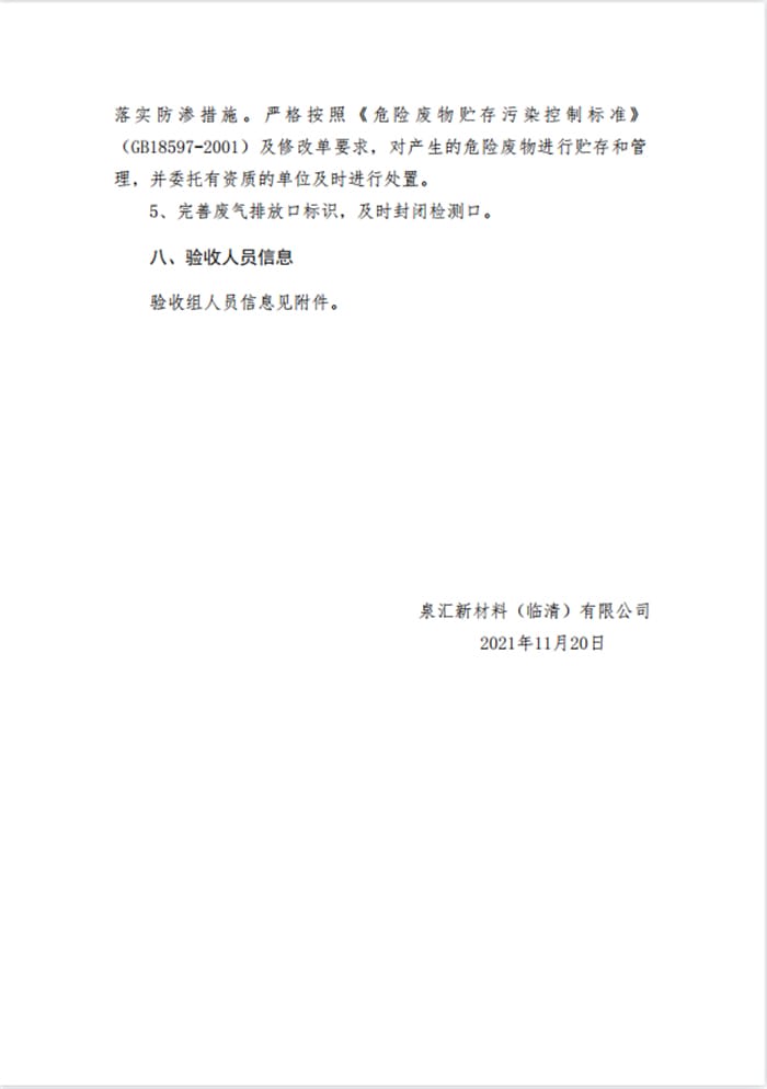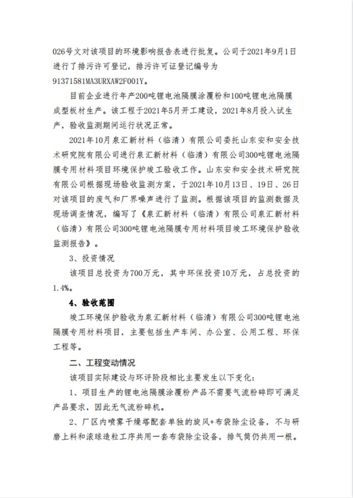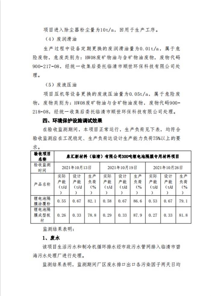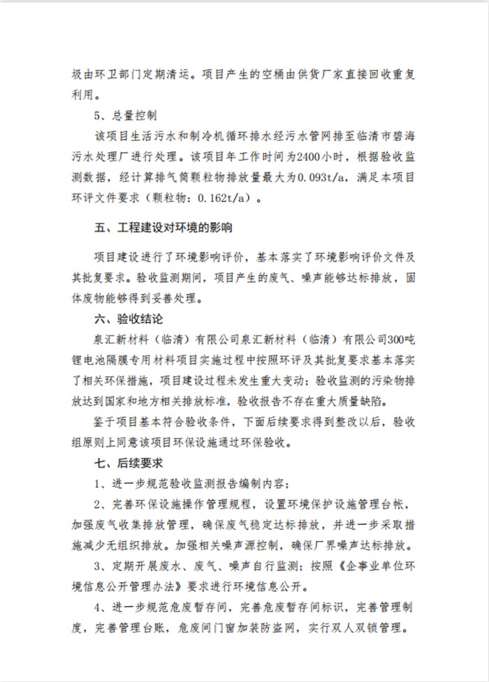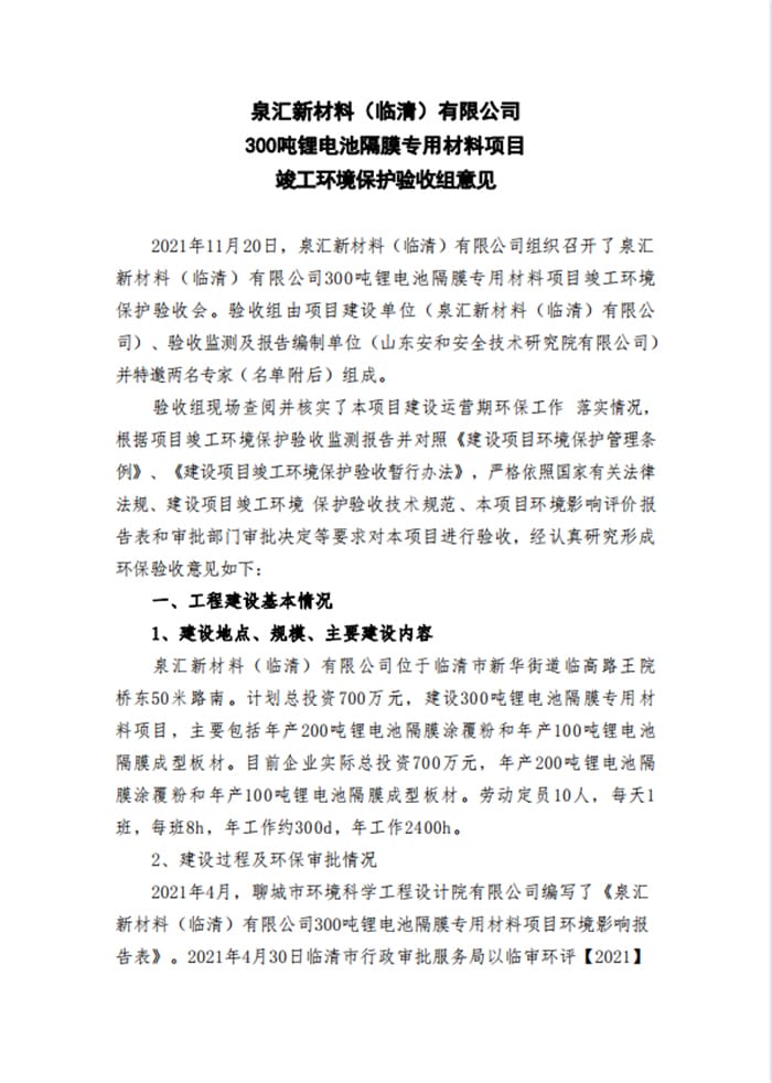泉汇新材料(临清)有限公司300吨锂电池隔膜专用材料项目验收意见