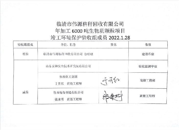 临清市伟源秸秆回收有限公年加工6000吨生物质颗粒项目验收签字