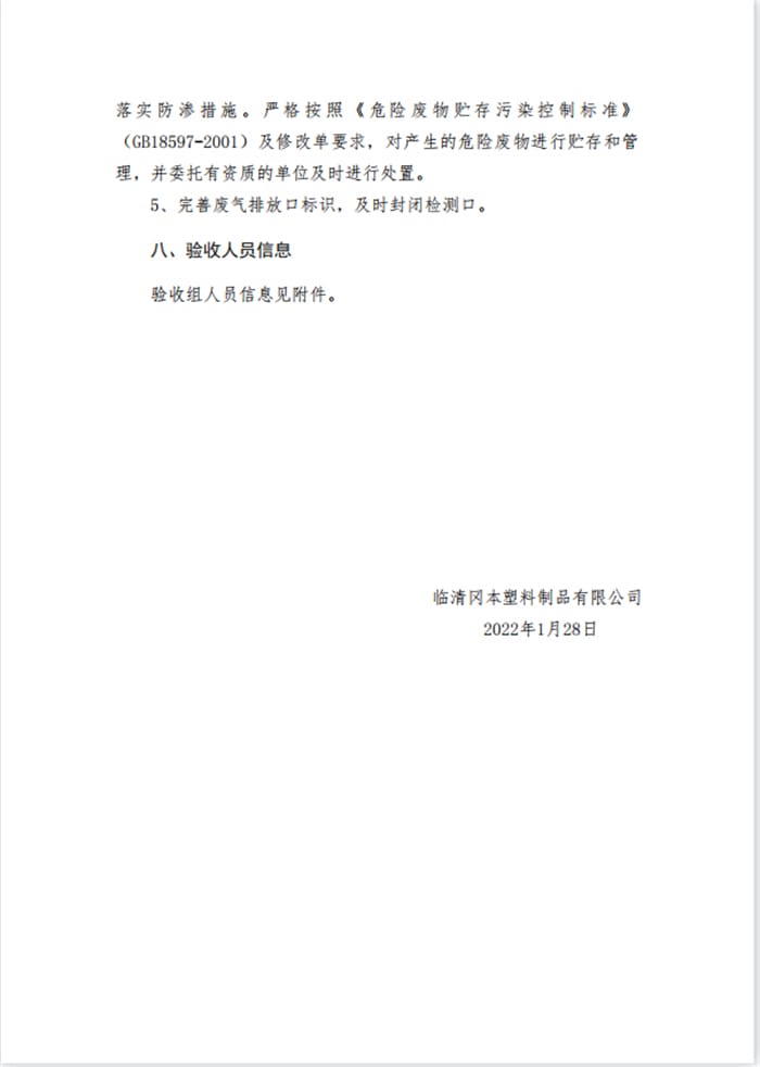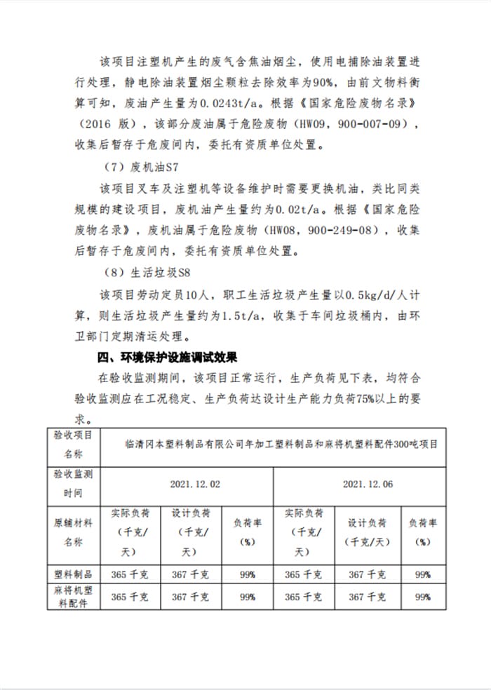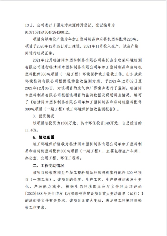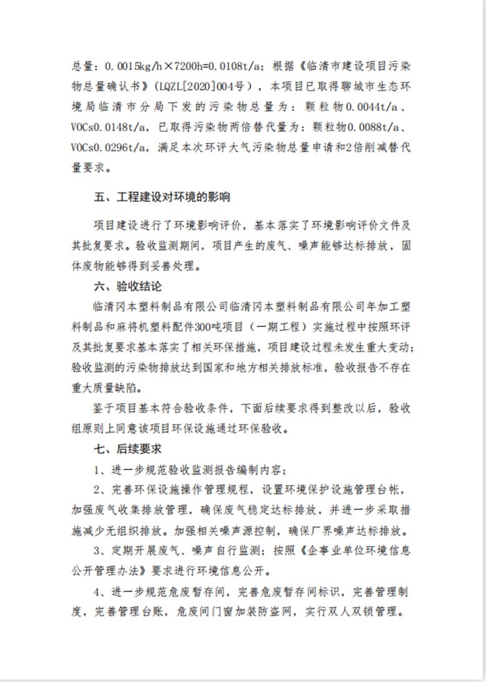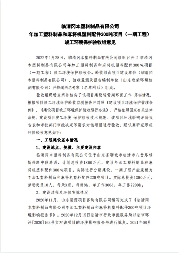 临清冈本塑料制品有限公司年加工塑料制品和麻将机塑料配件300吨项目验收意见