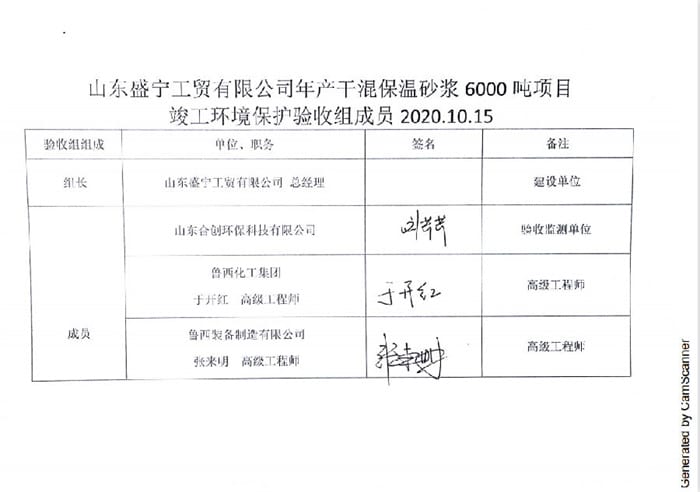 山东盛宁工贸有限公司年产干混保温砂浆6000吨项目竣工环境保护验收专家签字