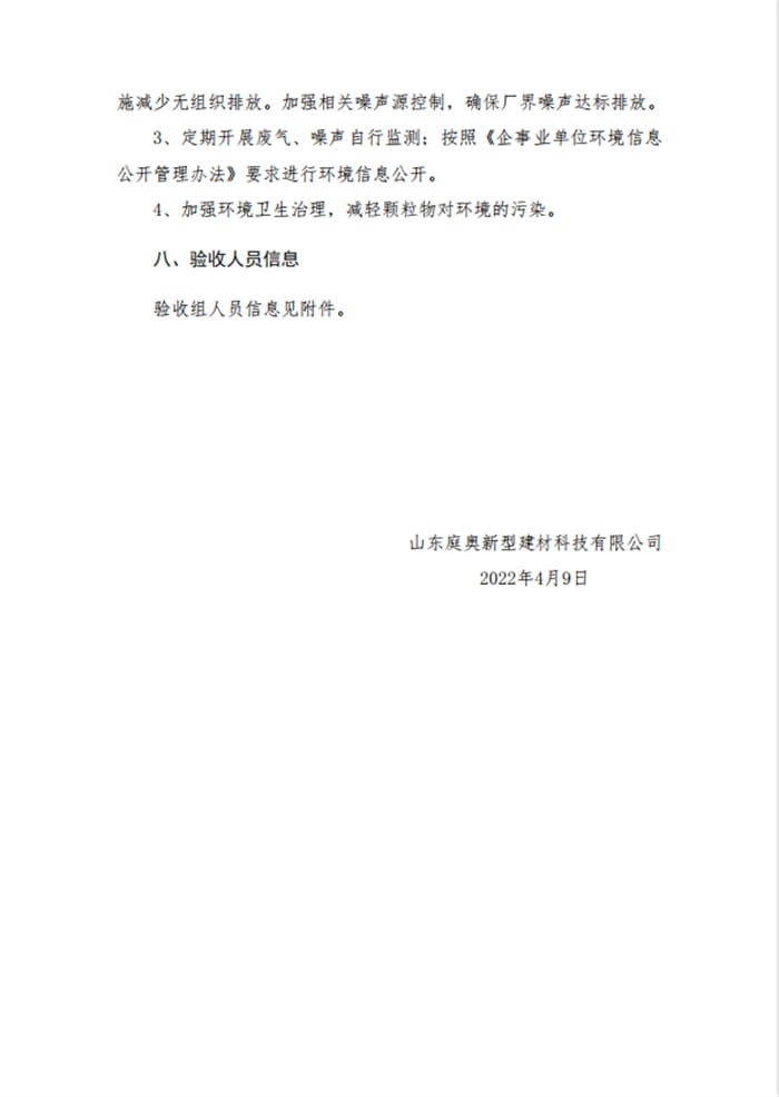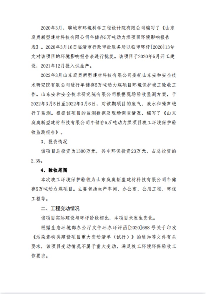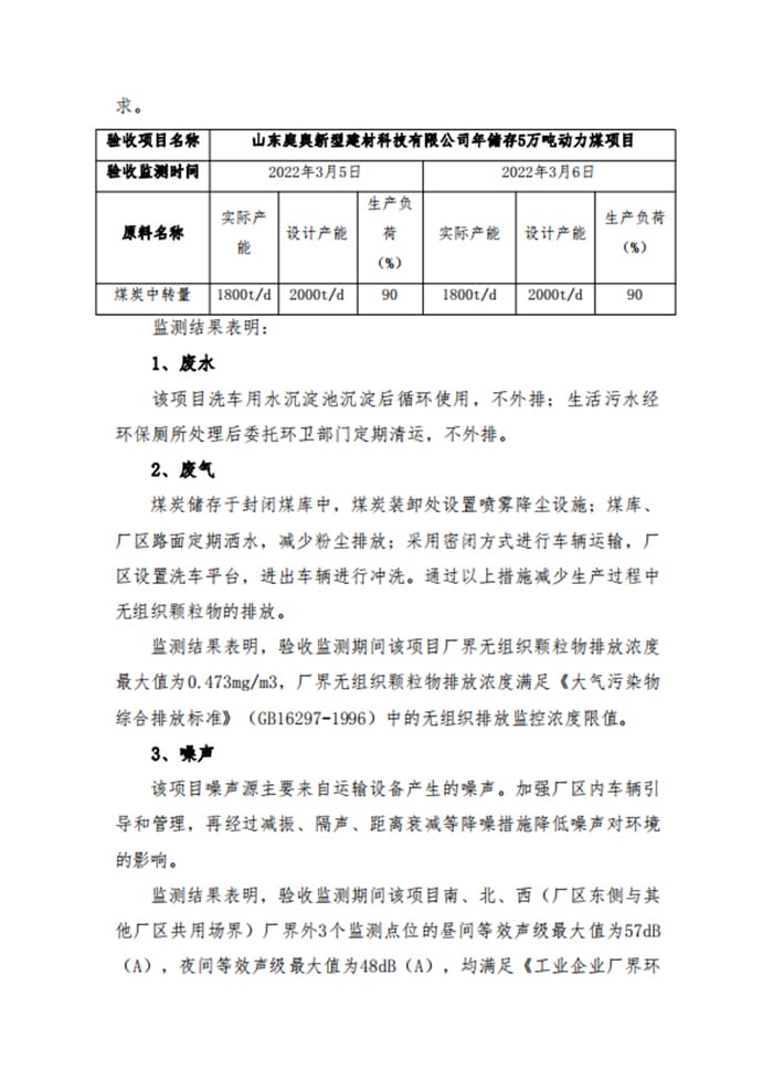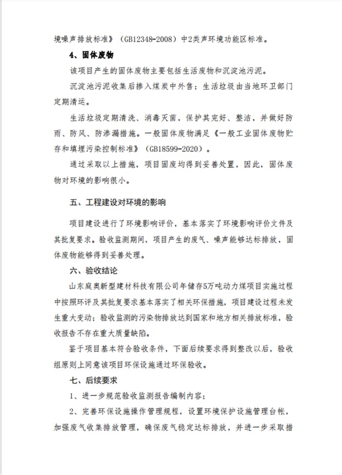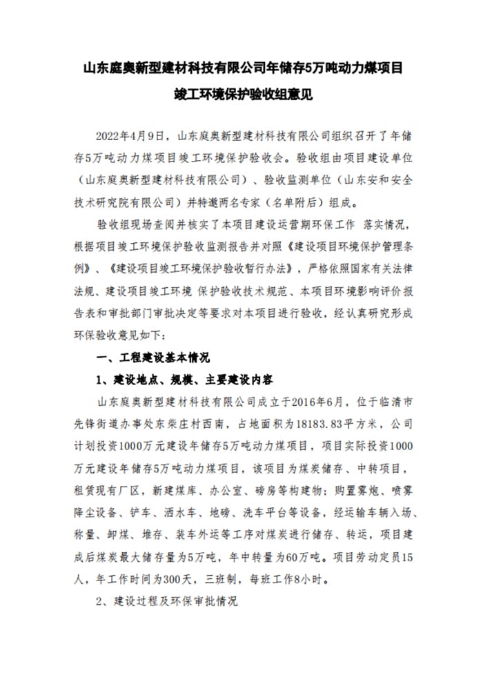 山东庭奥新型建材科技有限公司年储存5万吨动力煤项目验收意见