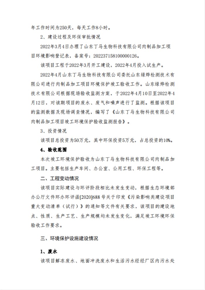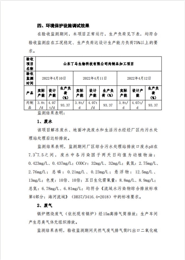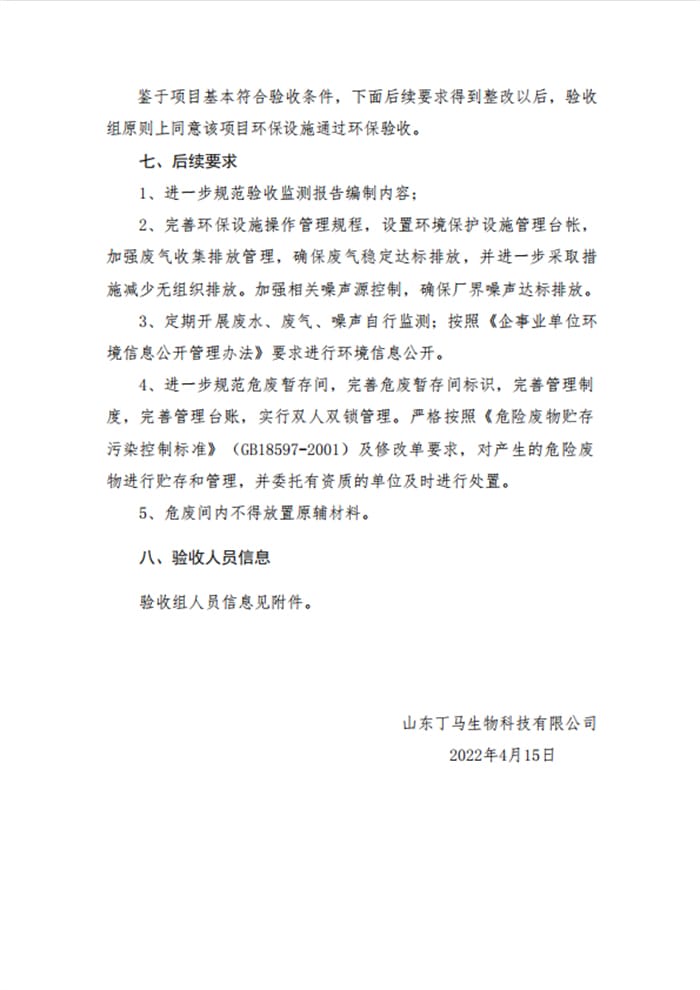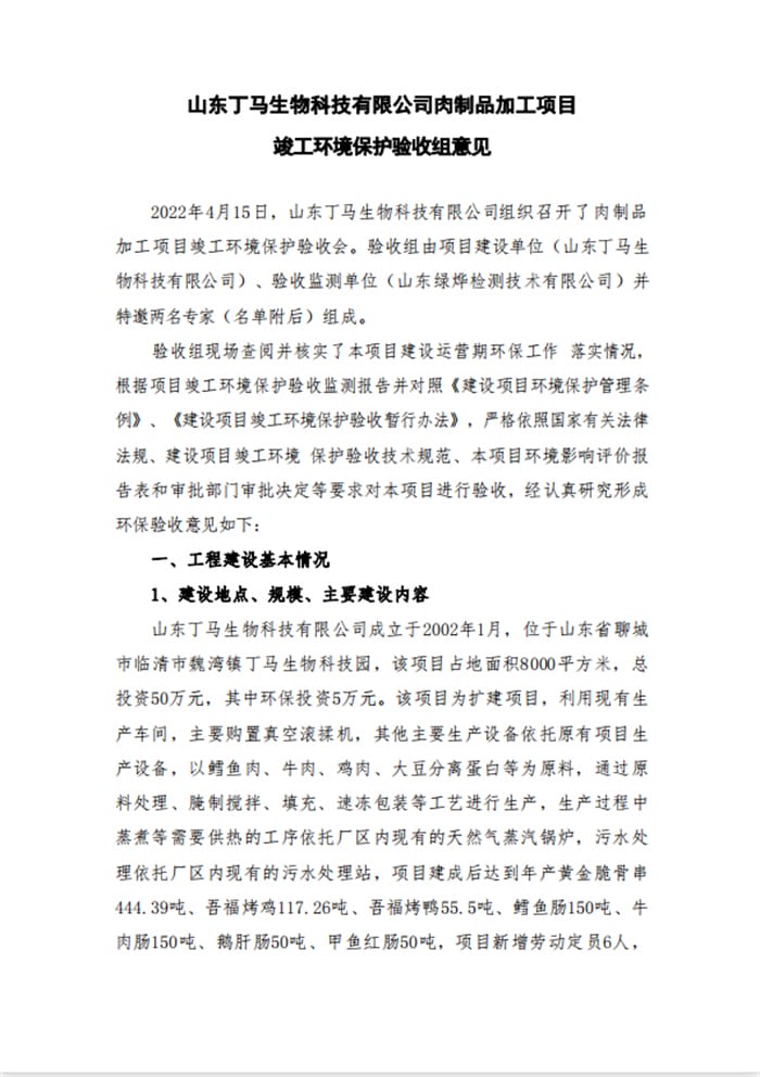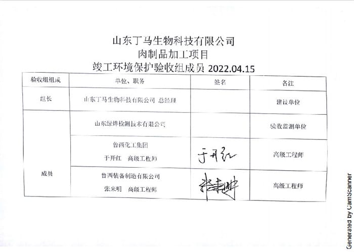 山东丁马生物科技有限公司肉制品加工项目验收意见及签字