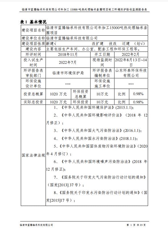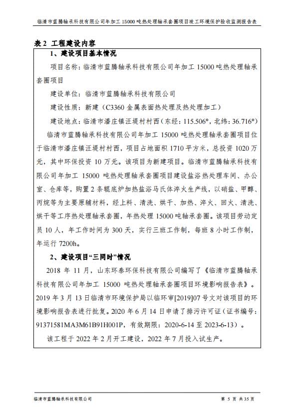临清市蓝腾轴承科技有限公司年加工15000吨热处理轴承套圈项目