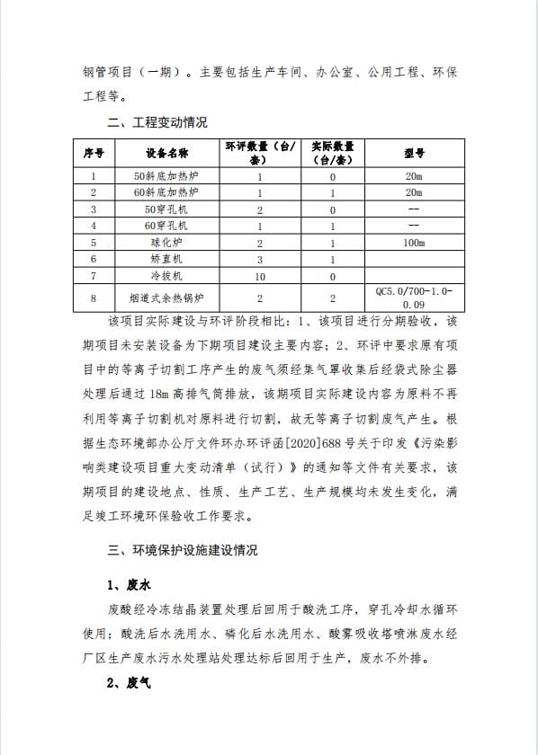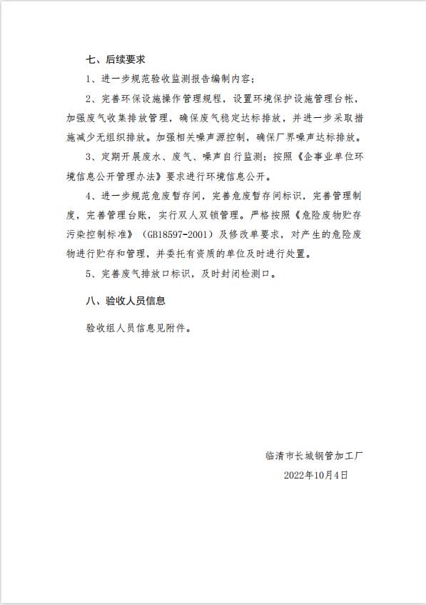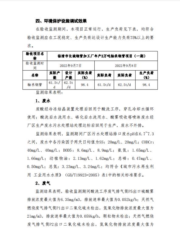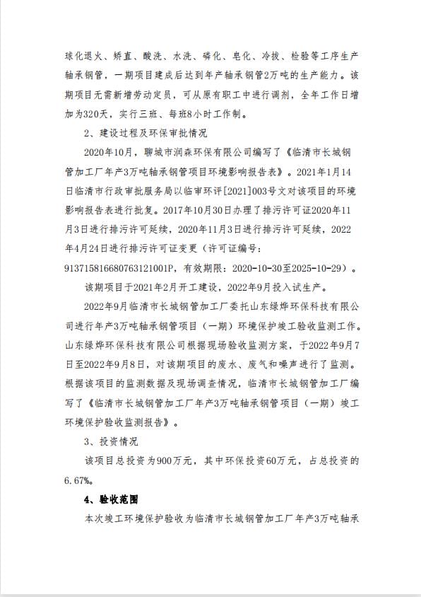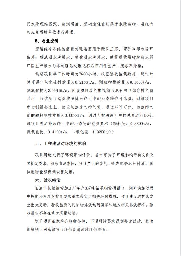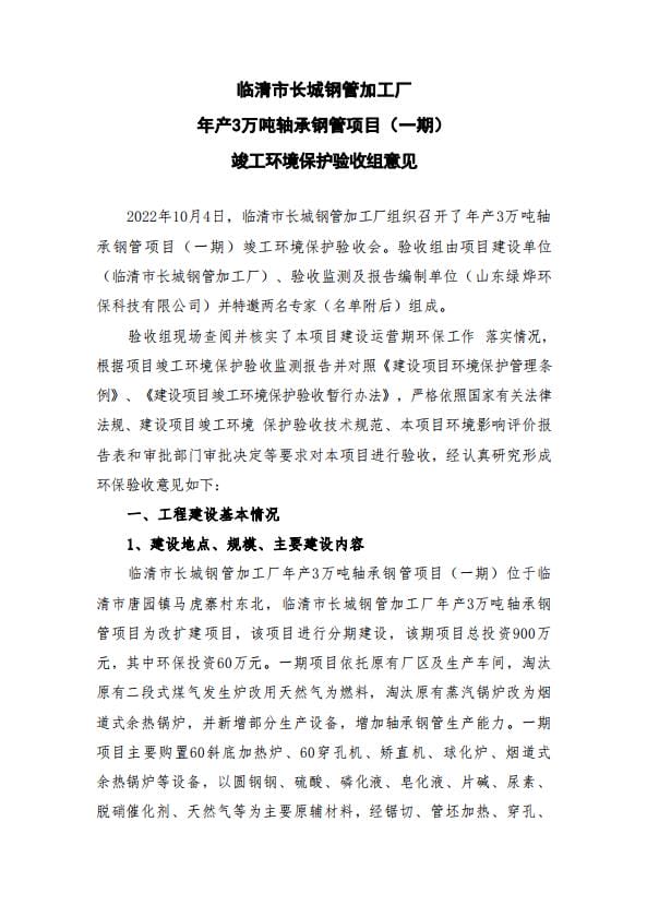 临清市长城钢管加工厂年产 3 万吨轴承钢管项目(一期)验收意见