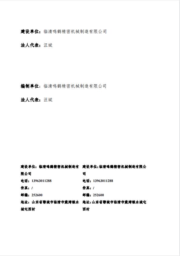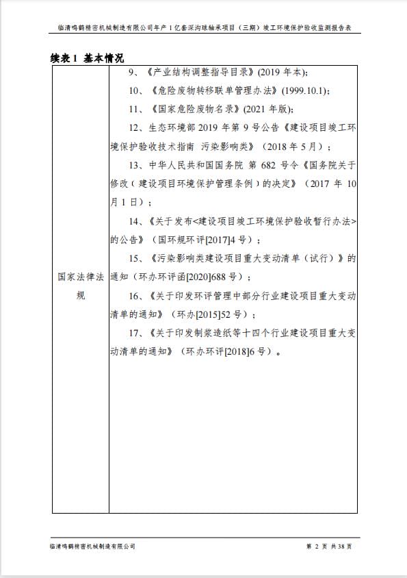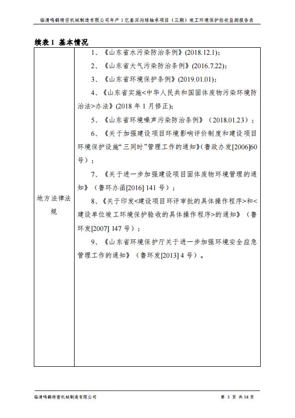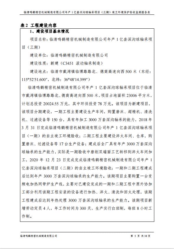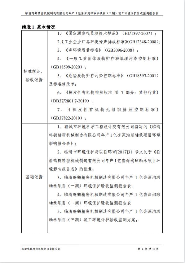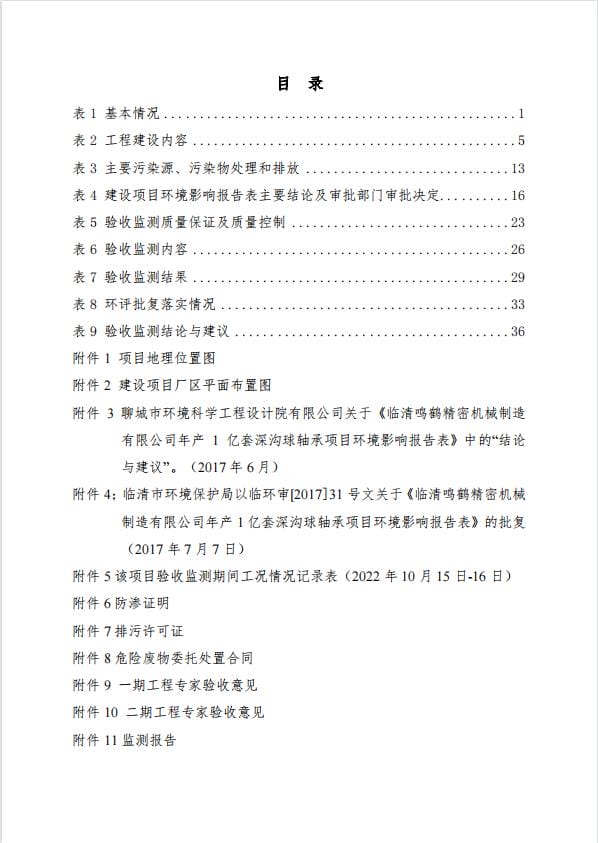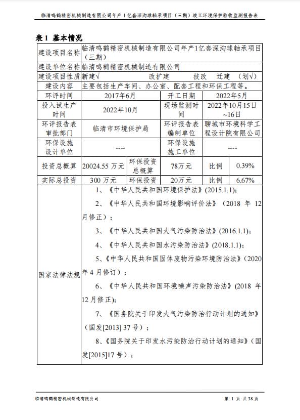 临清鸣鹤精密机械制造有限公司年产1亿套深沟球轴承项目(三期)验收报告